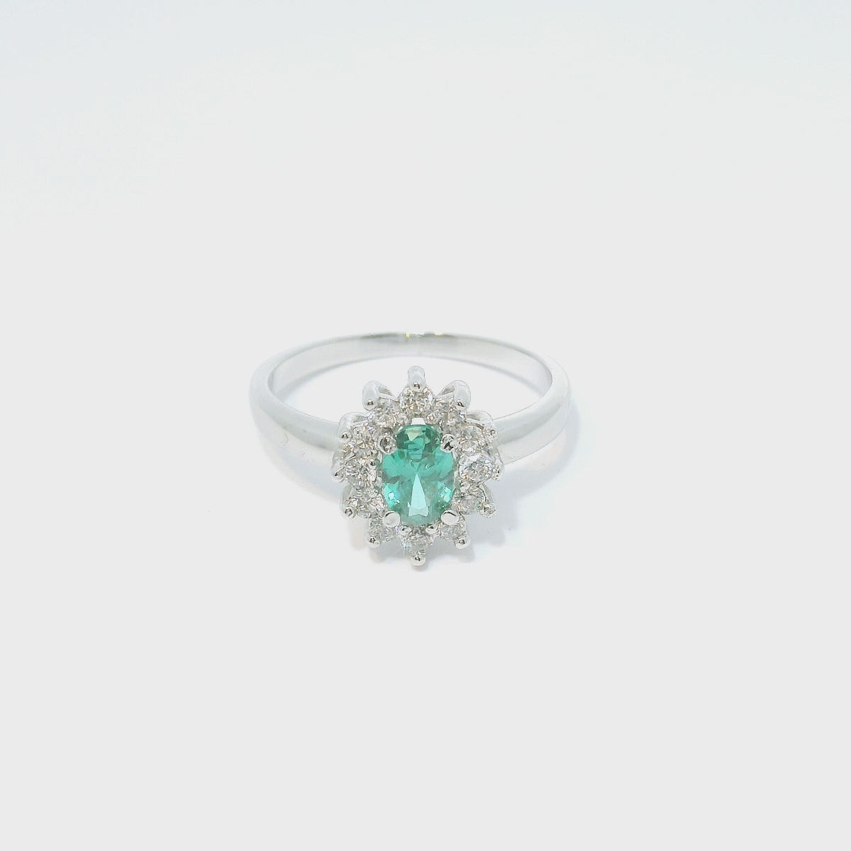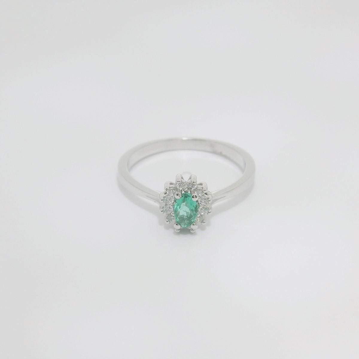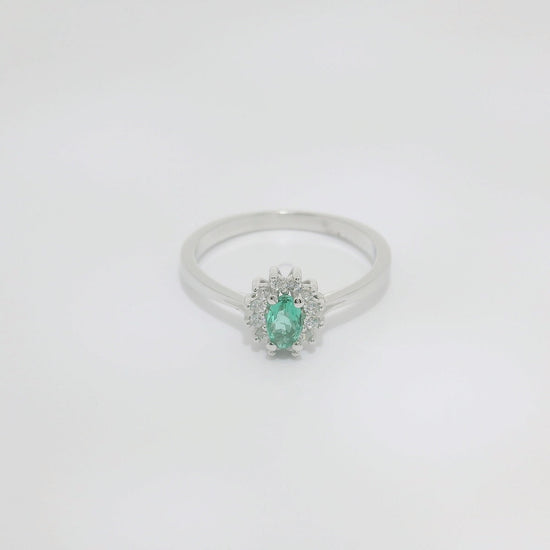 Pendientes de oro blanco de 18K con diamantes en talla brillante de calidad GH-VS y una esmeralda talla oval en el centro.
