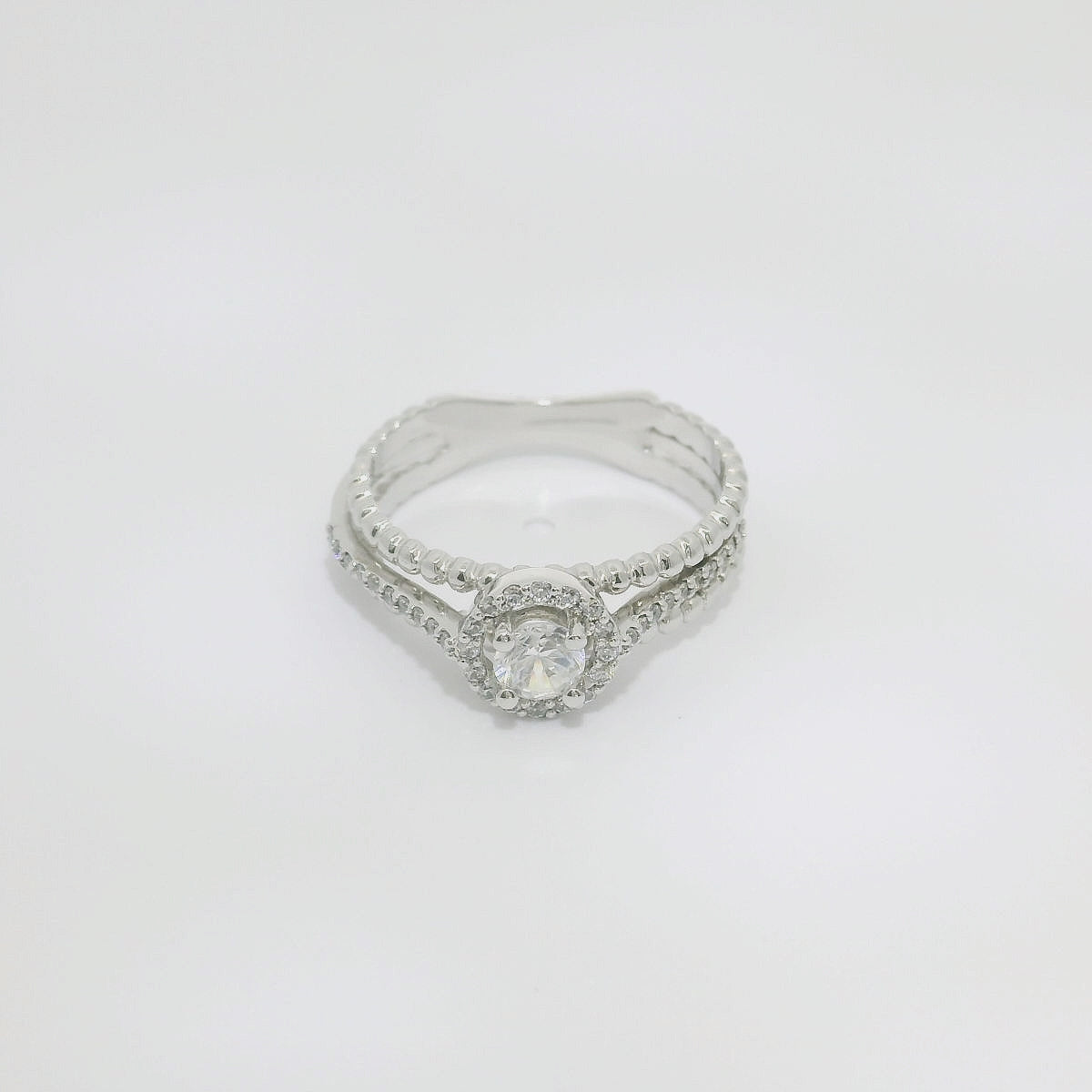 Anillo de oro blanco de 18K con diamantes en talla brillante. Piedra central de 0.16 CT, con 0.18 CT en la orla y el brazo. Calidad GH-VS.