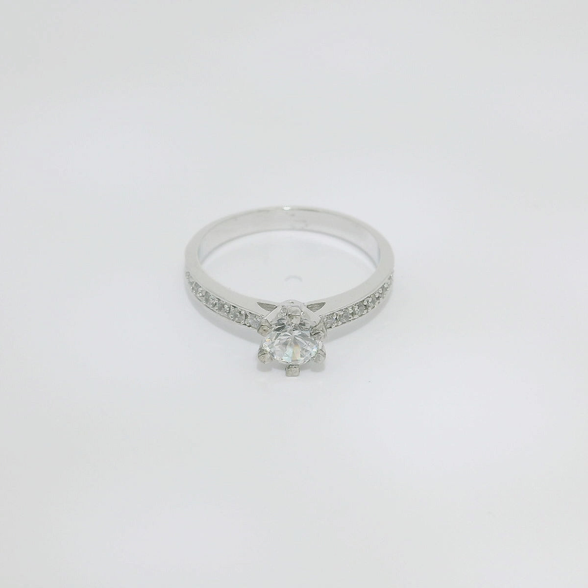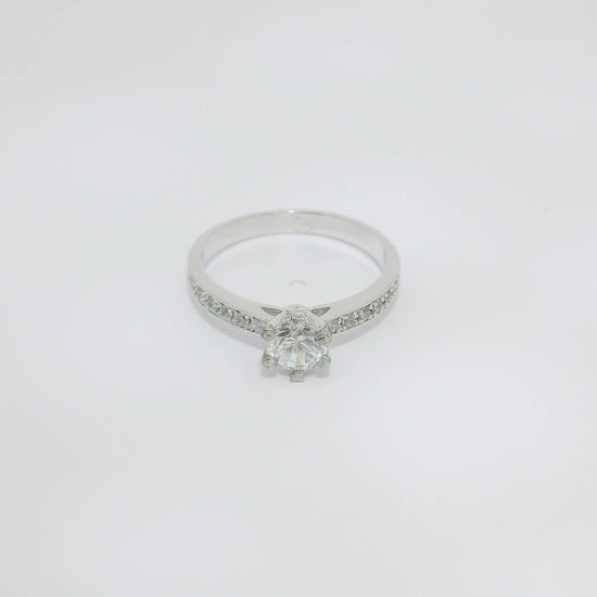 Anillo de oro blanco de 18K con diamantes en talla brillante. Piedra central de 0.50 CT, con 0.18 CT en el brazo. Calidad GH-VS.
