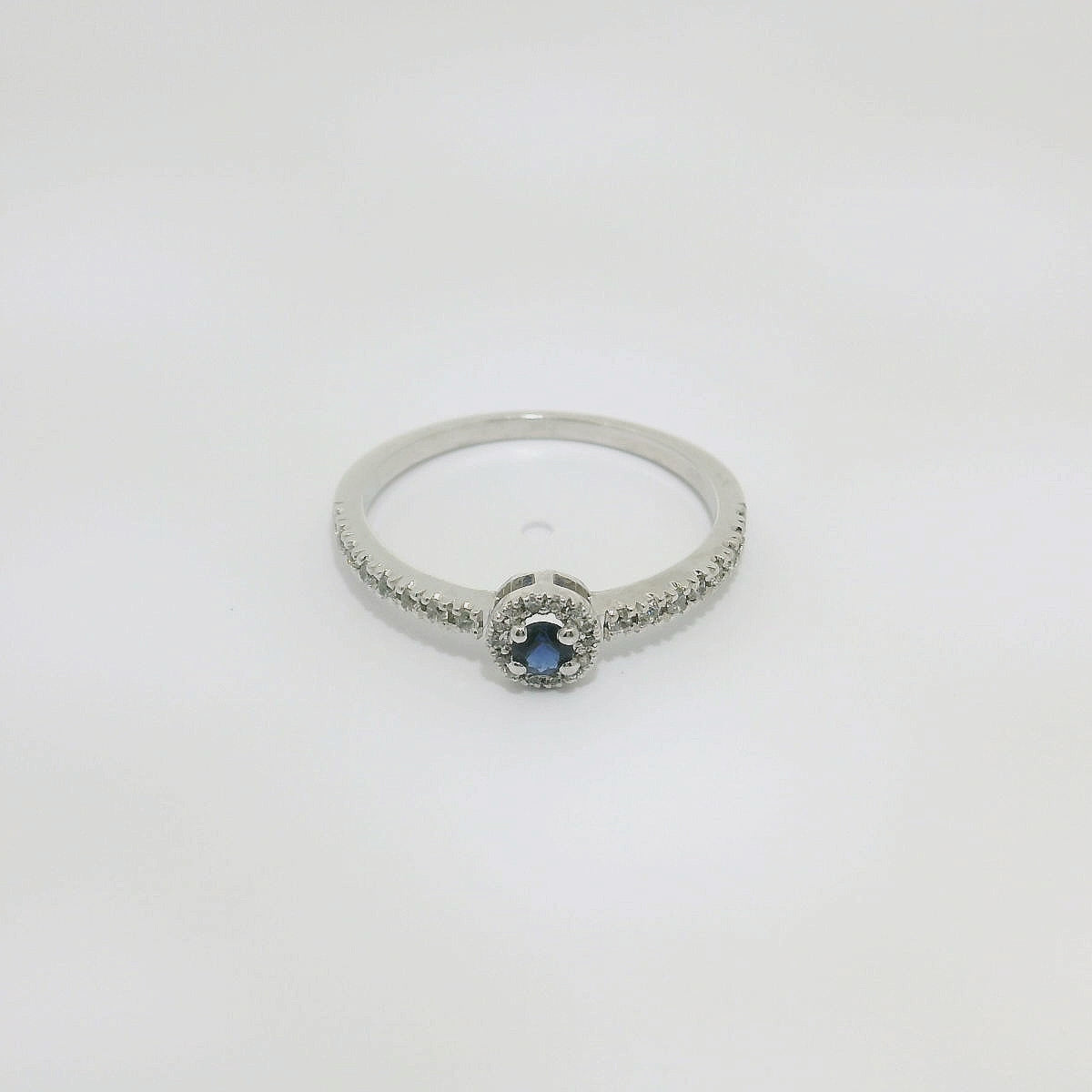 Anillo de oro blanco de 18K con diamantes en talla brillante. Piedra central de 0.08 CT, con 0.18 CT en la orla y el brazo. Calidad GH-VS.