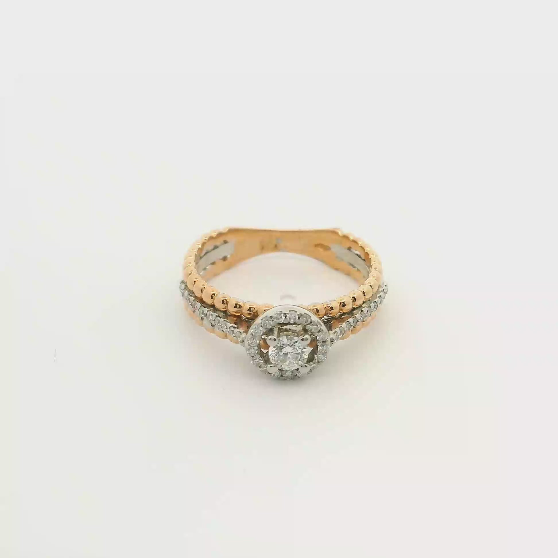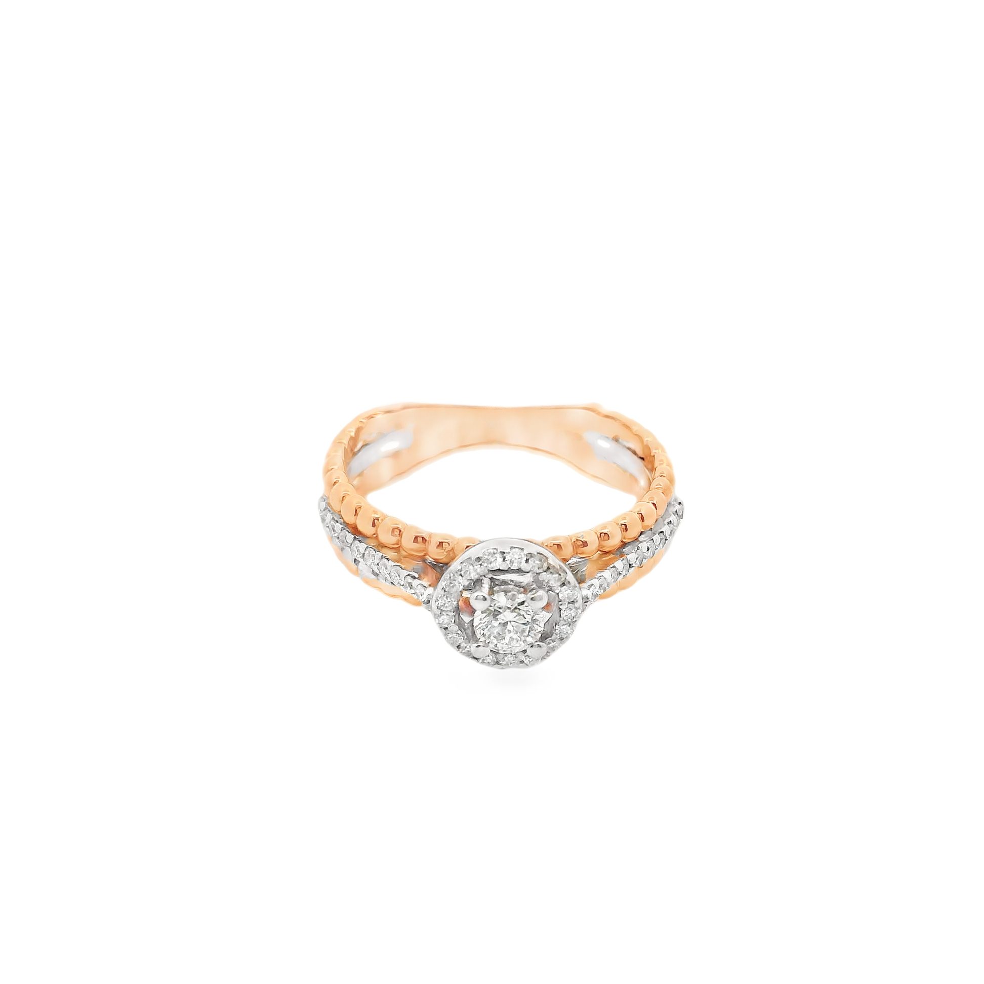 Anillo de oro blanco de 18K con diamantes en talla brillante. Piedra central de 0.16 CT, con 0.18 CTs total en la orla y el brazo. Calidad GH-VS.