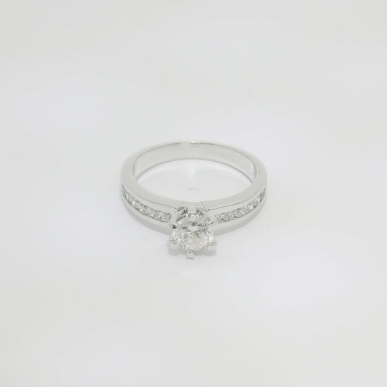 Anillo de oro blanco de 18K con diamante en talla brillante. Piedra central de 0.40 CT, con 0.25 CT en el brazo. Calidad GH-VS.