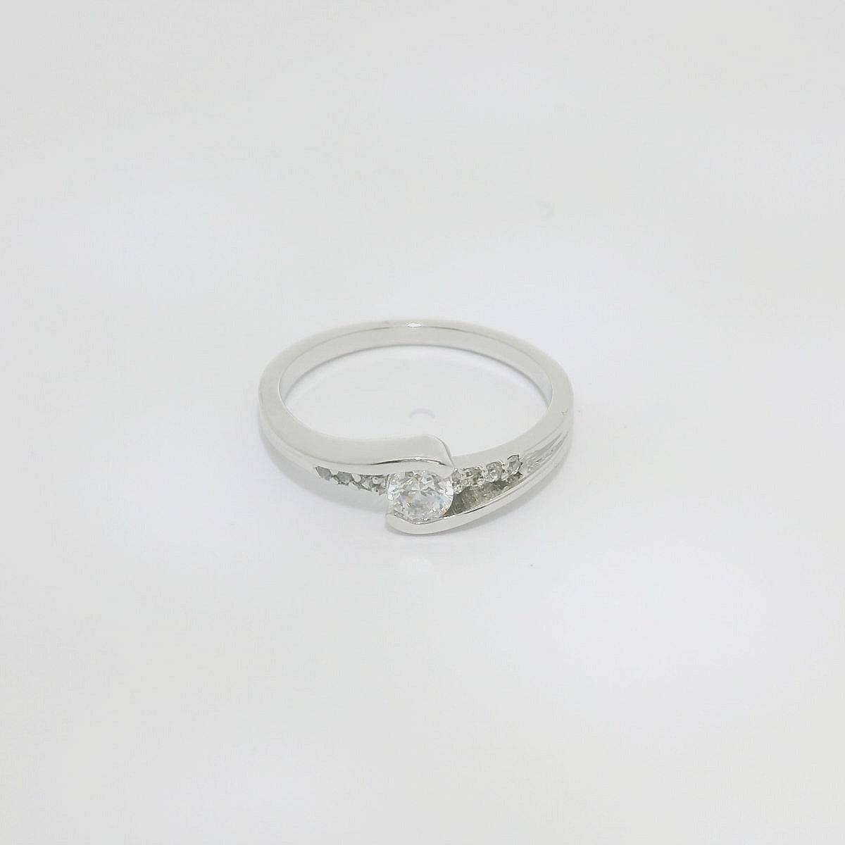 Anillo de oro blanco de 18K con diamante en talla brillante. Piedra central de 0.20 CT, con 0.06 CT en el brazo. Calidad GH-VS.
