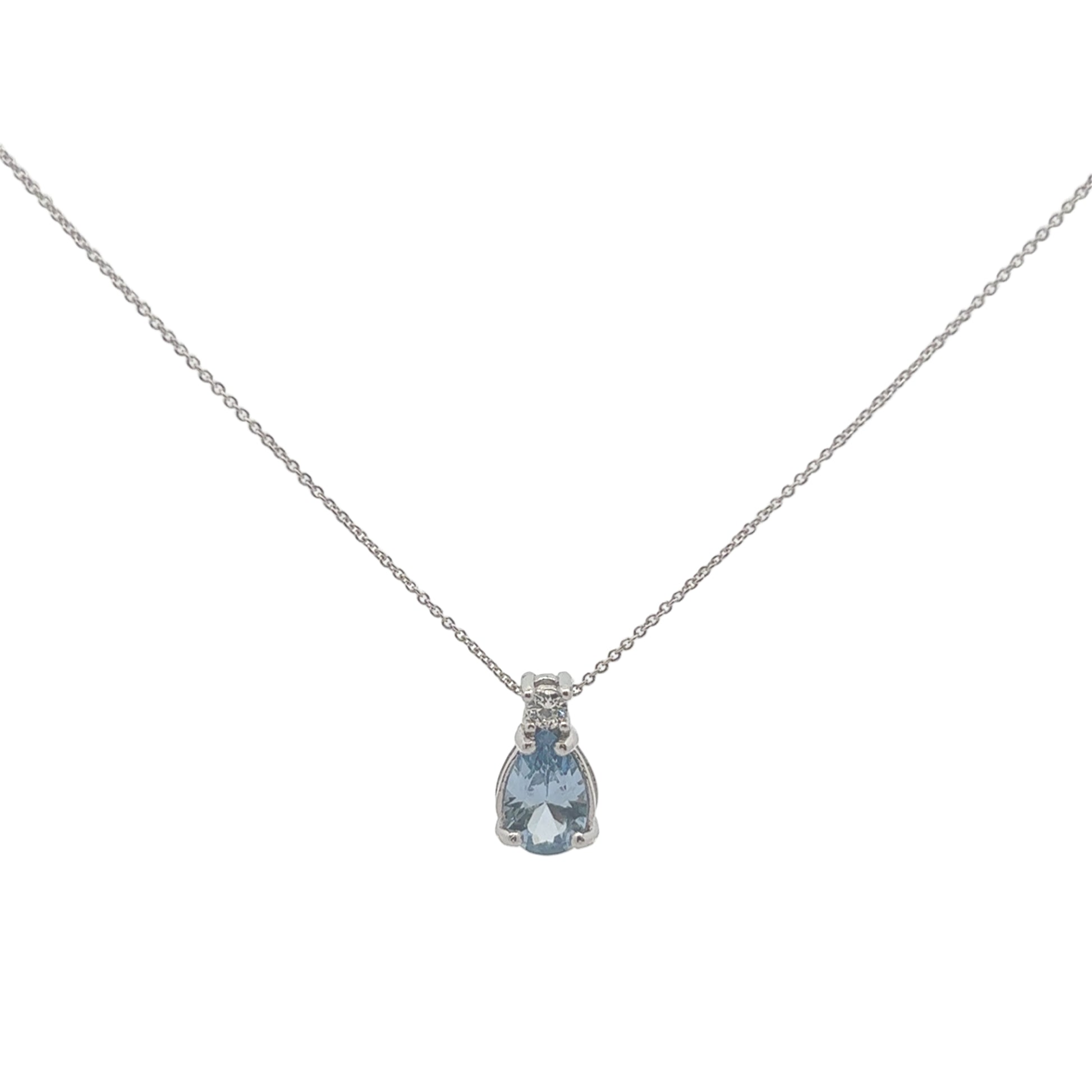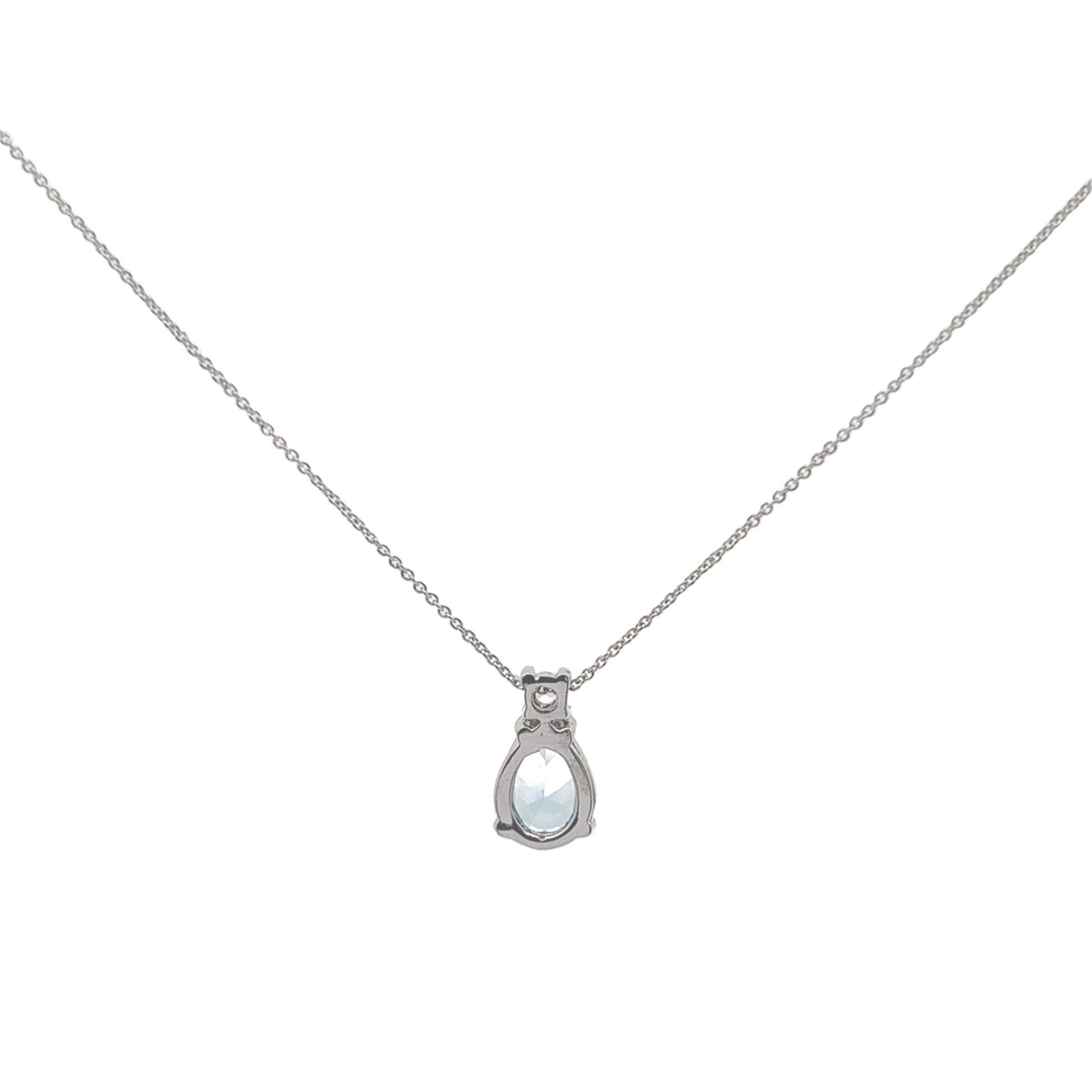 Colgante de oro blanco de 18K con diamante en talla brillante de 0.05 CT y calidad GH-VS con centro en Aguamarina talla pera de 1.00 CT.