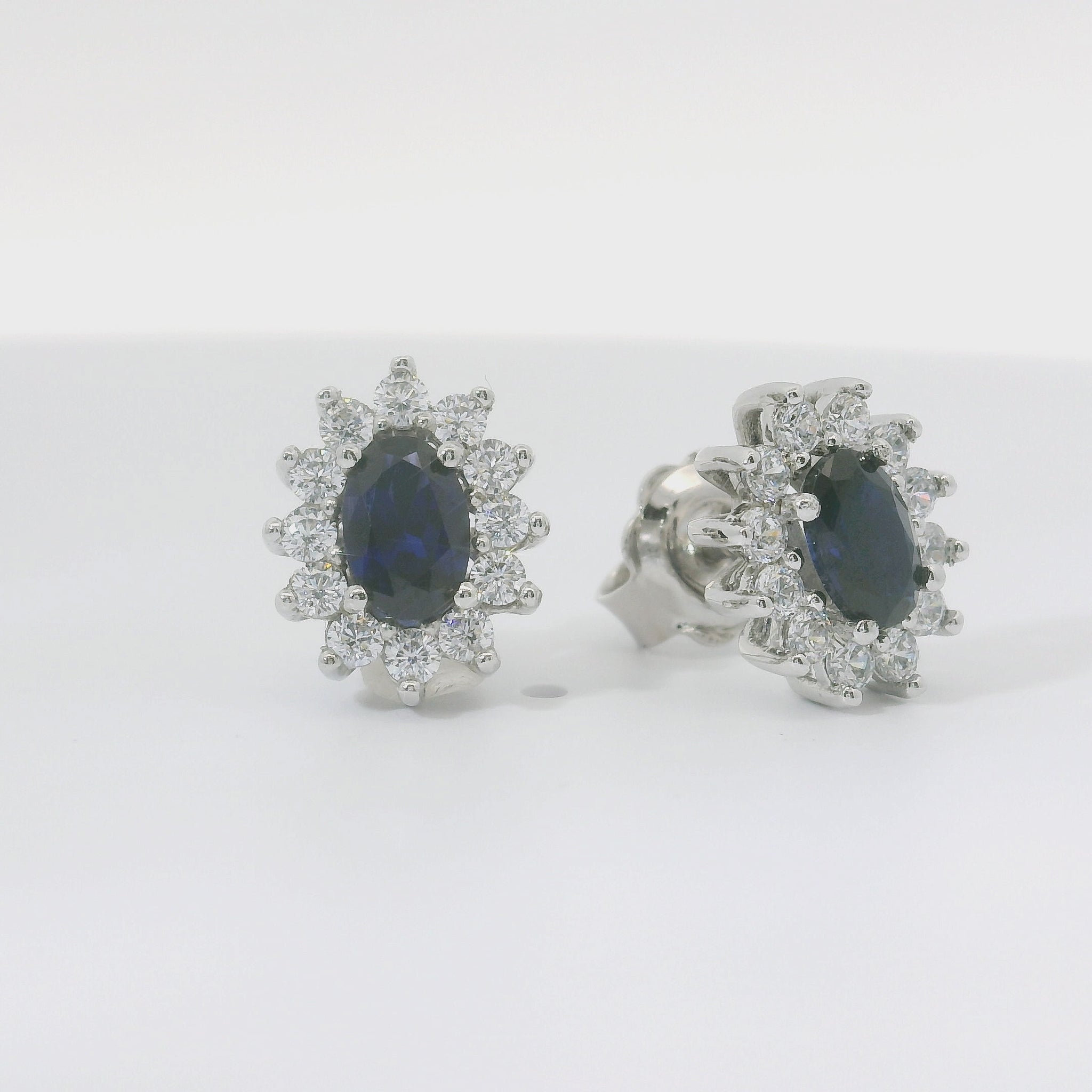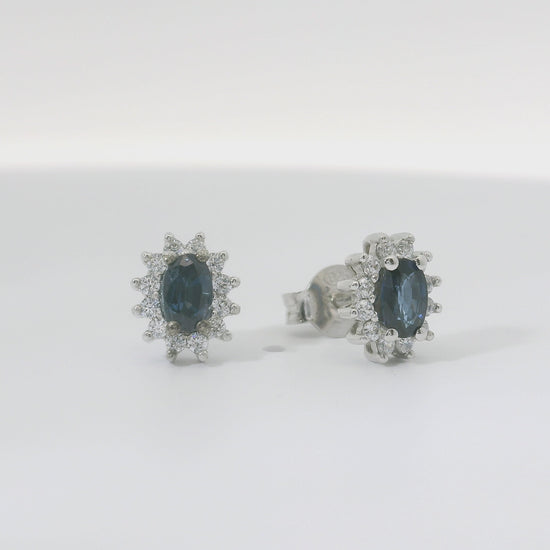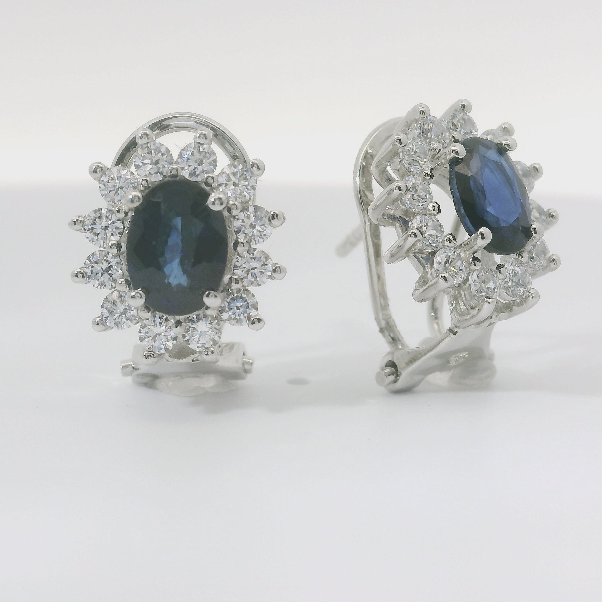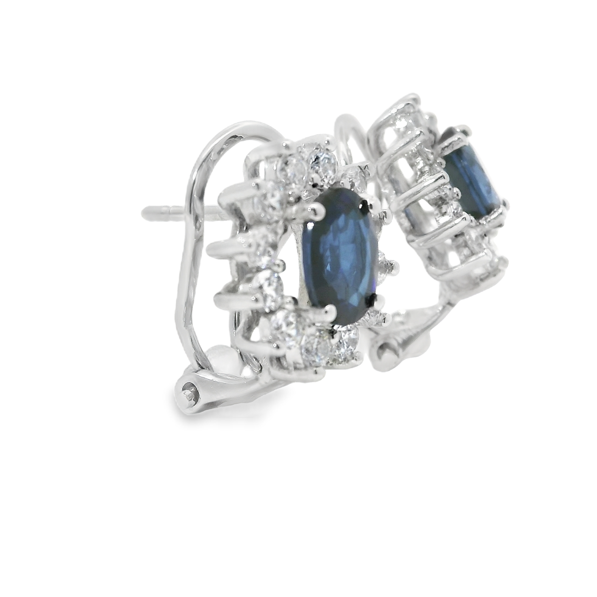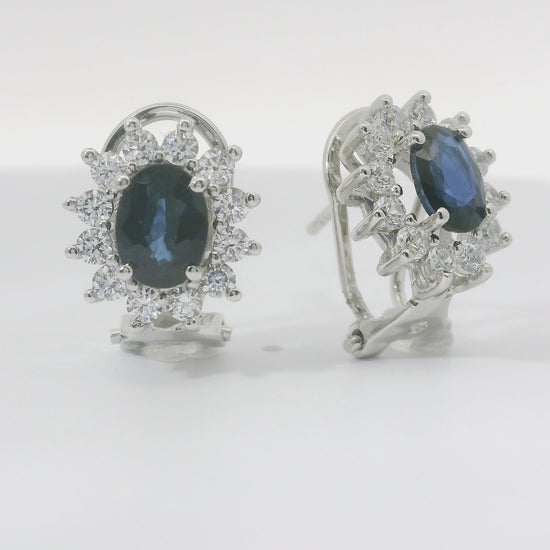 Pendientes de oro blanco de 18K con diamantes en talla brillante de calidad GH-VS y con un zafiro talla oval en el centro.