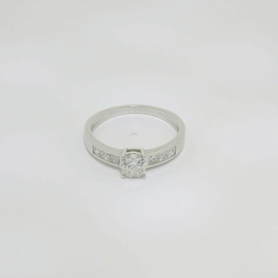 Anillo de oro blanco de 18K con diamante en talla Cuison de 0.50 CT, con 0.96 CT en el brazo talla brillante. Calidad GH-VS.