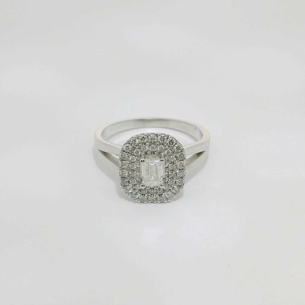 Anillo de oro blanco de 18K con diamantes. Piedra central talla esmeralda de 0.30 CT y 0.31 CT en la orla talla brillante. Calidad GH-VS.