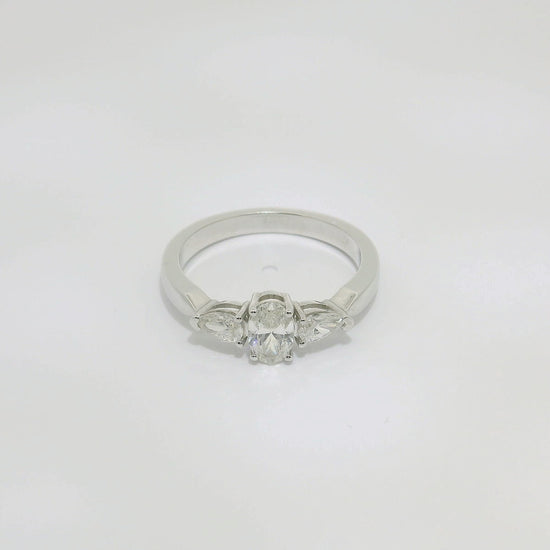 Anillo de oro blanco de 18K con diamante en talla Oval de 0.40 CT, con 2 diamantes talla Pera de 0.32 CT en el brazo. Calidad GH-VS.