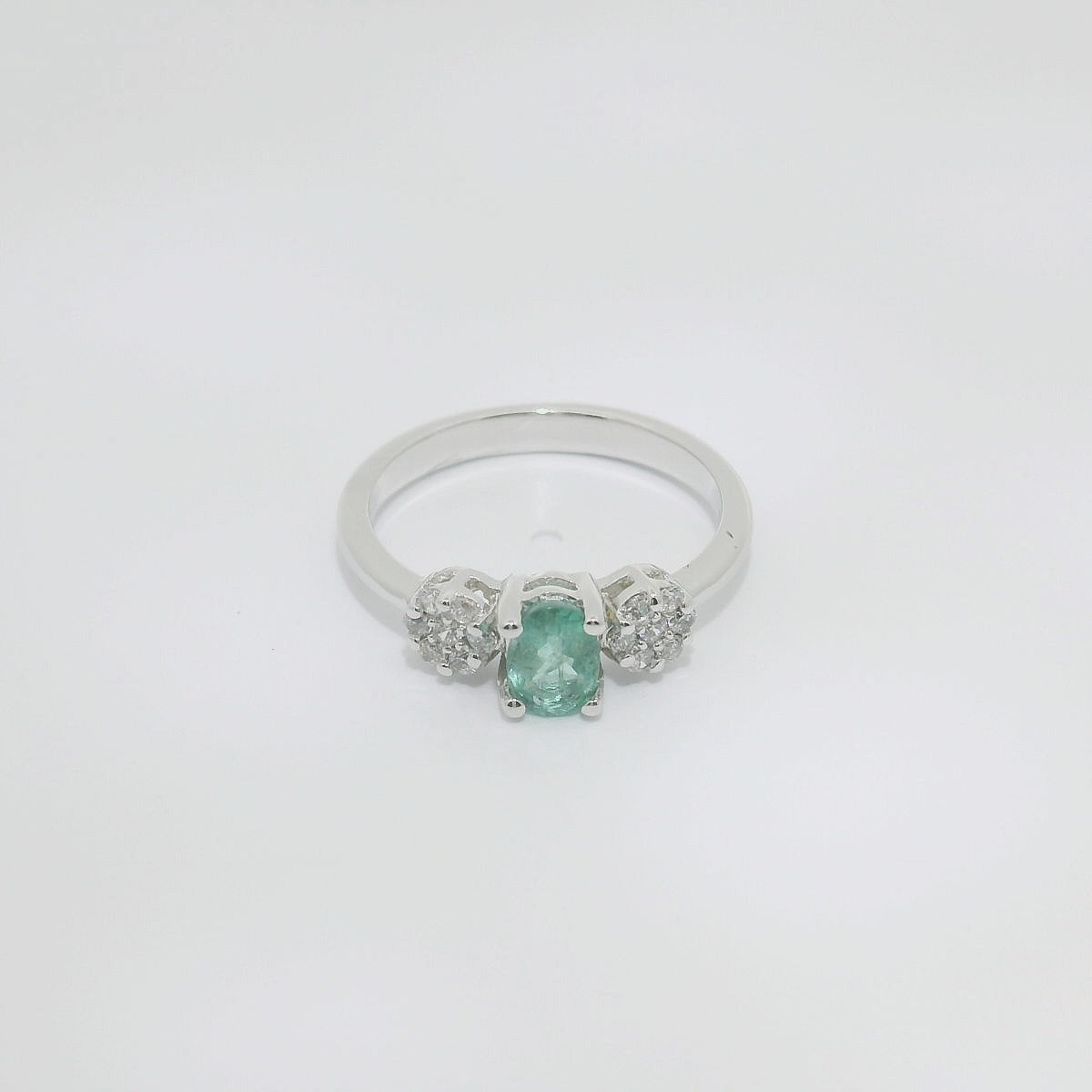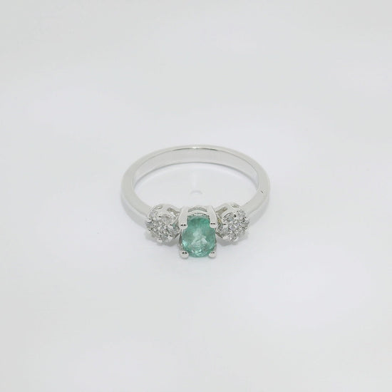 Anillo de oro blanco de 18K con esmeralda central de 0.40 CTS, con 0.14 CTS de diamantes talla brillante en el brazo. Calidad GH-VS.