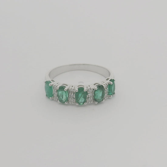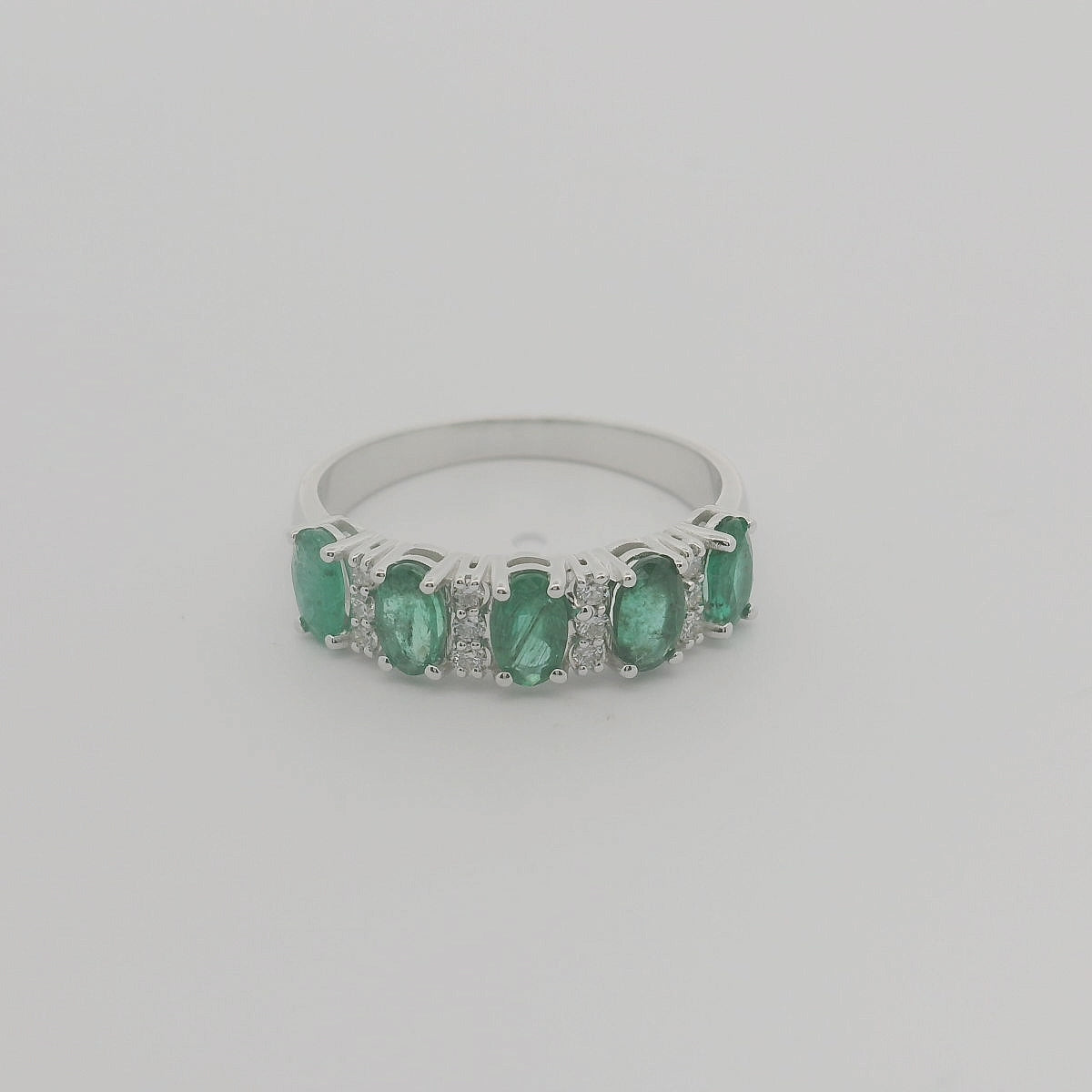 Este exquisito anillo presenta un diseño elegante con esmeraldas brillantes que capturan la luz de manera impresionante. La combinación de piedras preciosas verdes y diamantes crea un contraste deslumbrante, perfecto para cualquier ocasión especial.