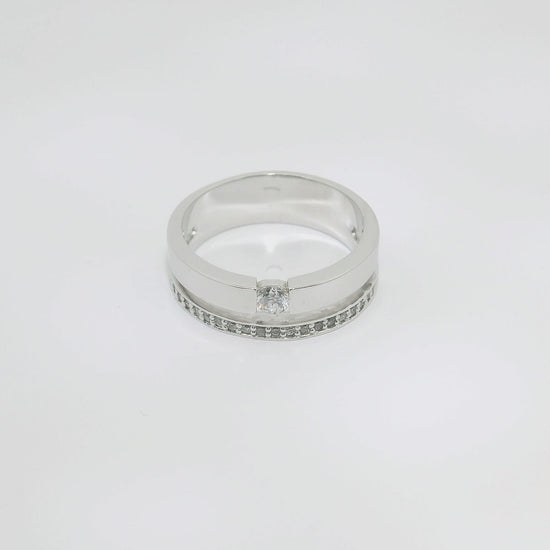 Anillo de oro blanco de 18K con diamante en talla brillante. Piedra central de 0.10 CT, con 0.13 CT en el brazo. Calidad GH-VS.
