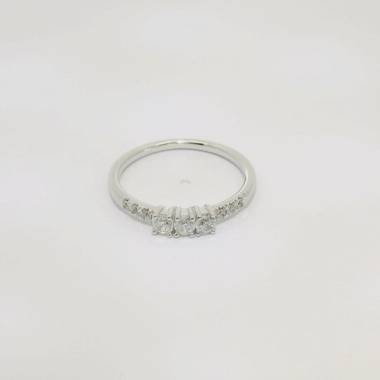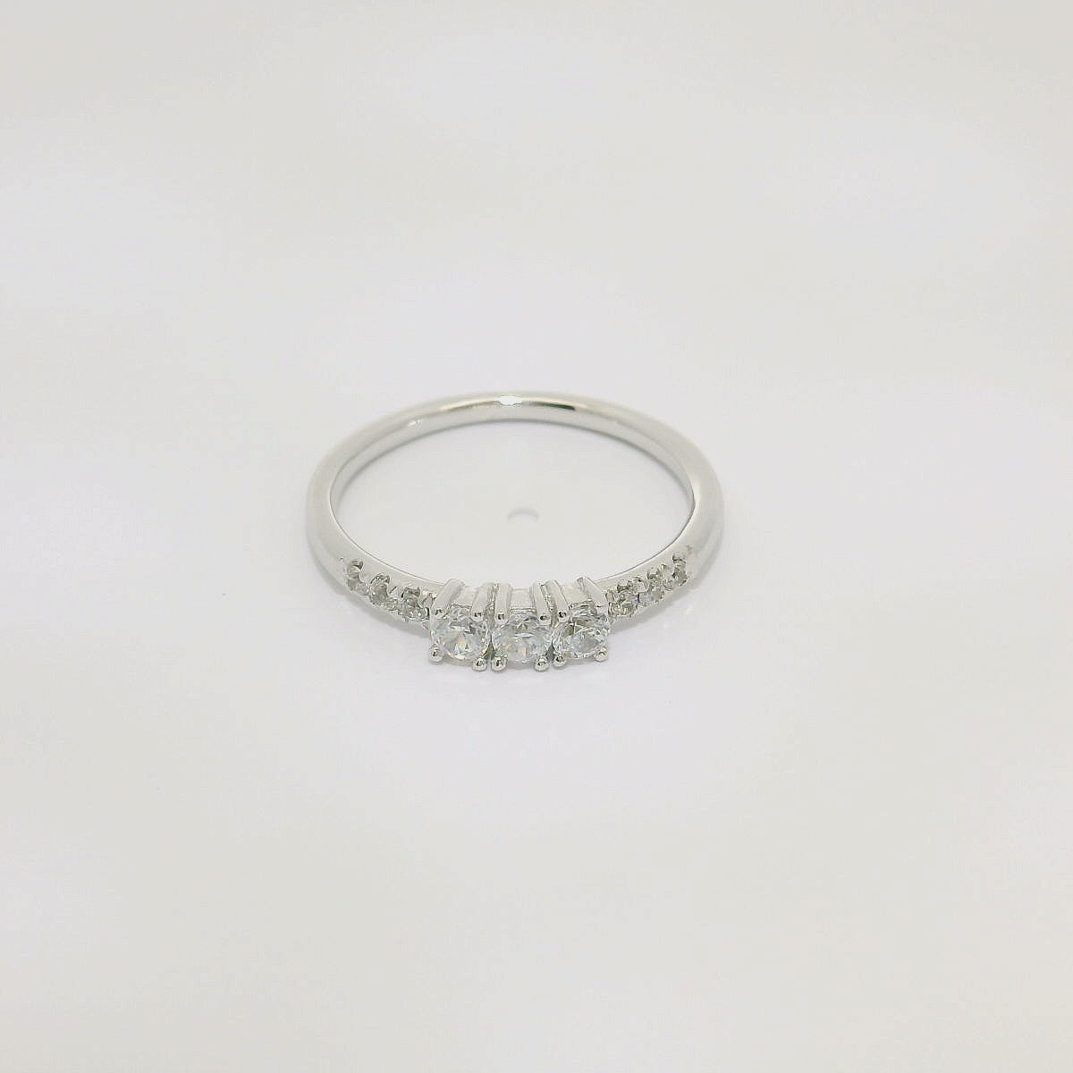 Anillo de oro blanco de 18K con diamantes en talla brillante. Piedras centrales de 0.09 CT, con 0.27 CT en el brazo. Calidad GH-VS.