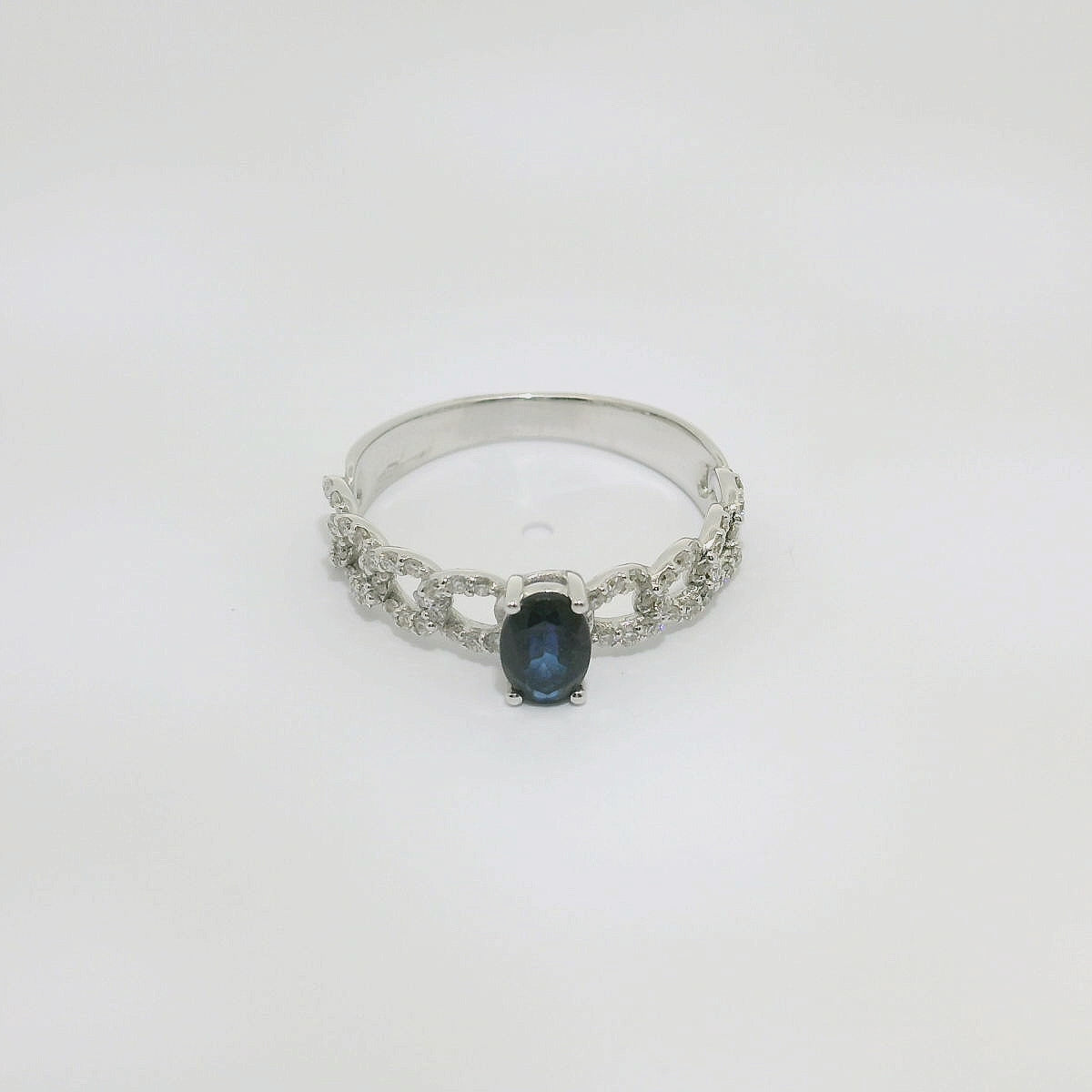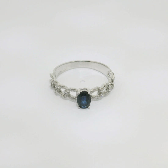 Anillo de oro blanco de 18K con zafiro oval de 0.50 CTS, con 0.31 CTS de diamantes talla brillante en el brazo. Calidad GH-VS.