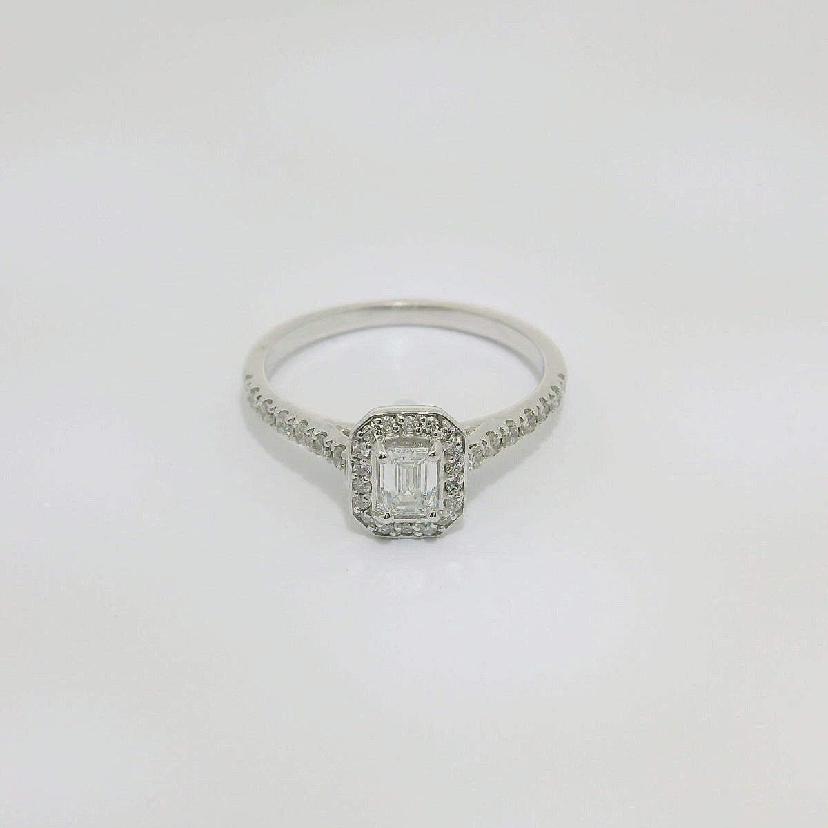 Anillo de oro blanco de 18K con diamantes en talla Esmeralda de 0.30 CT, con 0.30 CT en la orla y el brazo talla brillante. Calidad GH-VS.