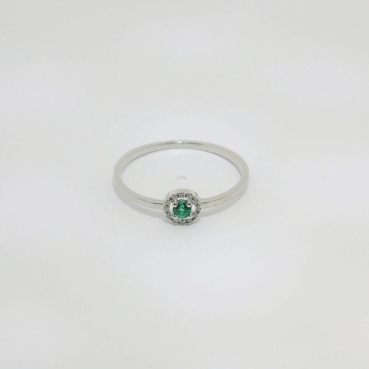 Anillo de oro blanco de 18K con esmeralda central de 0.06 CTS, con 0.06 CTS de diamantes talla brillante en la orla y el brazo. Calidad GH-VS.